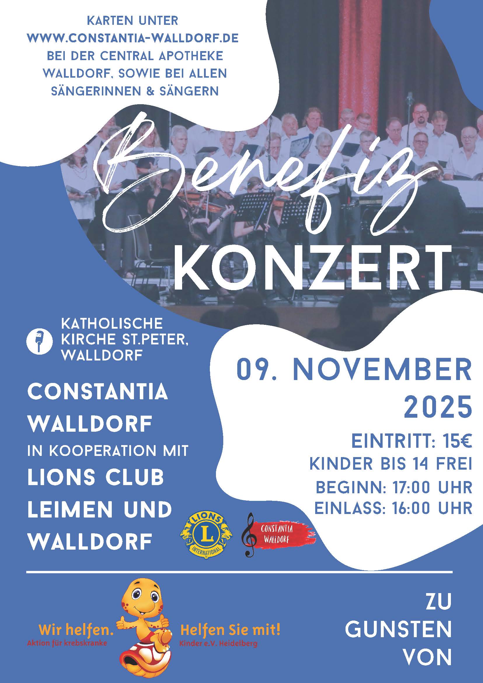 Die Contantia Walldorf gibt am 09.11.2025 in der katholischen Kirche "St. Peter" in Walldorf ab 17:00 Uhr in Zusammenarbeit mit dem Lions Club Leimen ein Benefizkonzert zugunsten der Aktion für krebskranke Kinder e. V. Heidelberg.